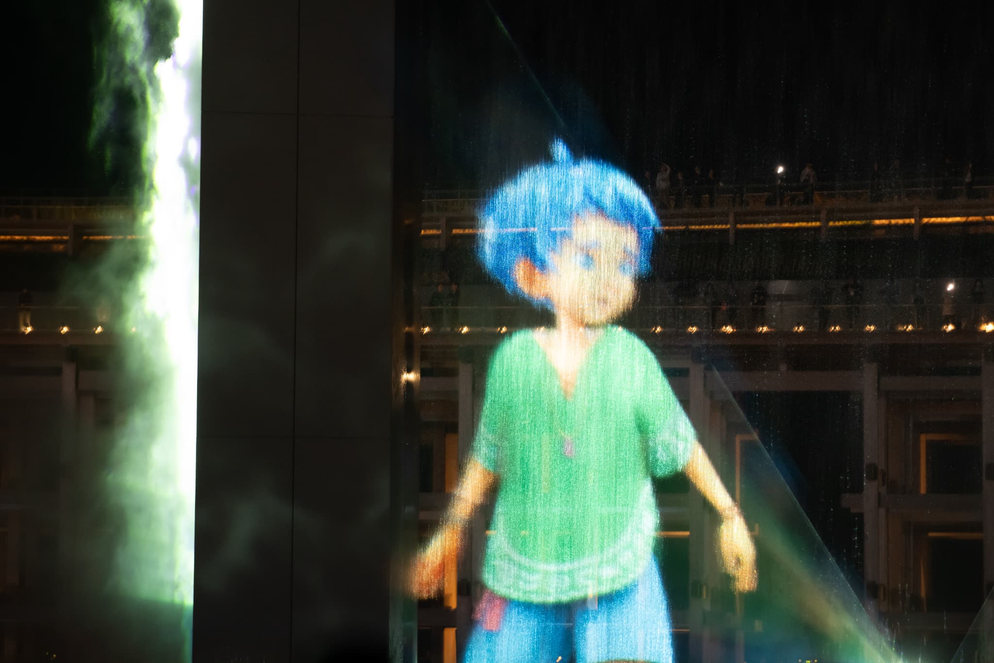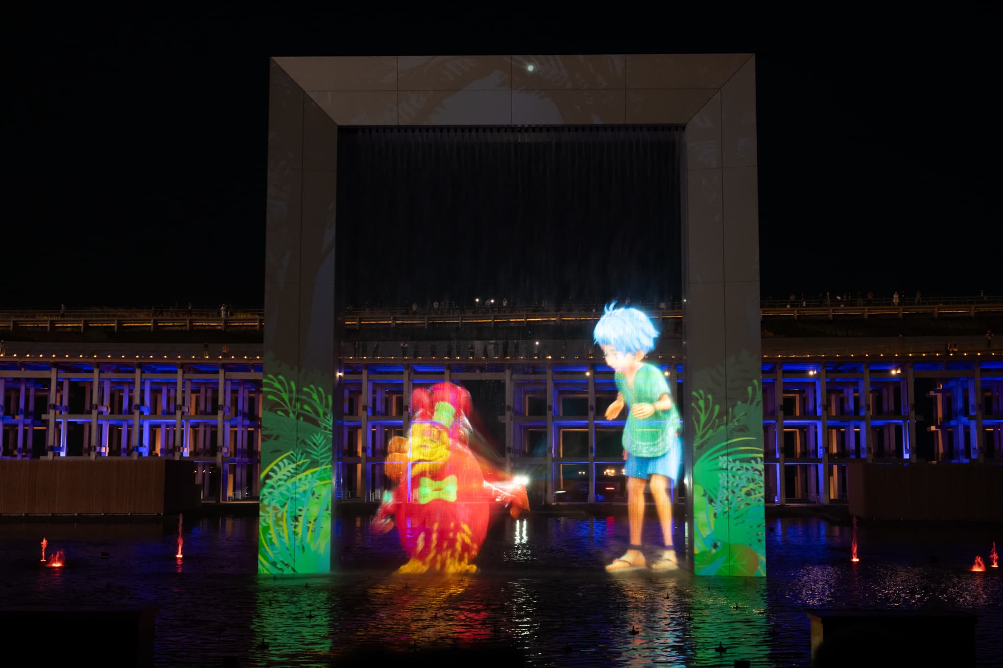 ウォータースクリーンに映し出される映像や、巨大オブジェ左右に広がる扇状の噴水にも投影される映像演出など、目の前に広がる光と水の世界は圧巻。