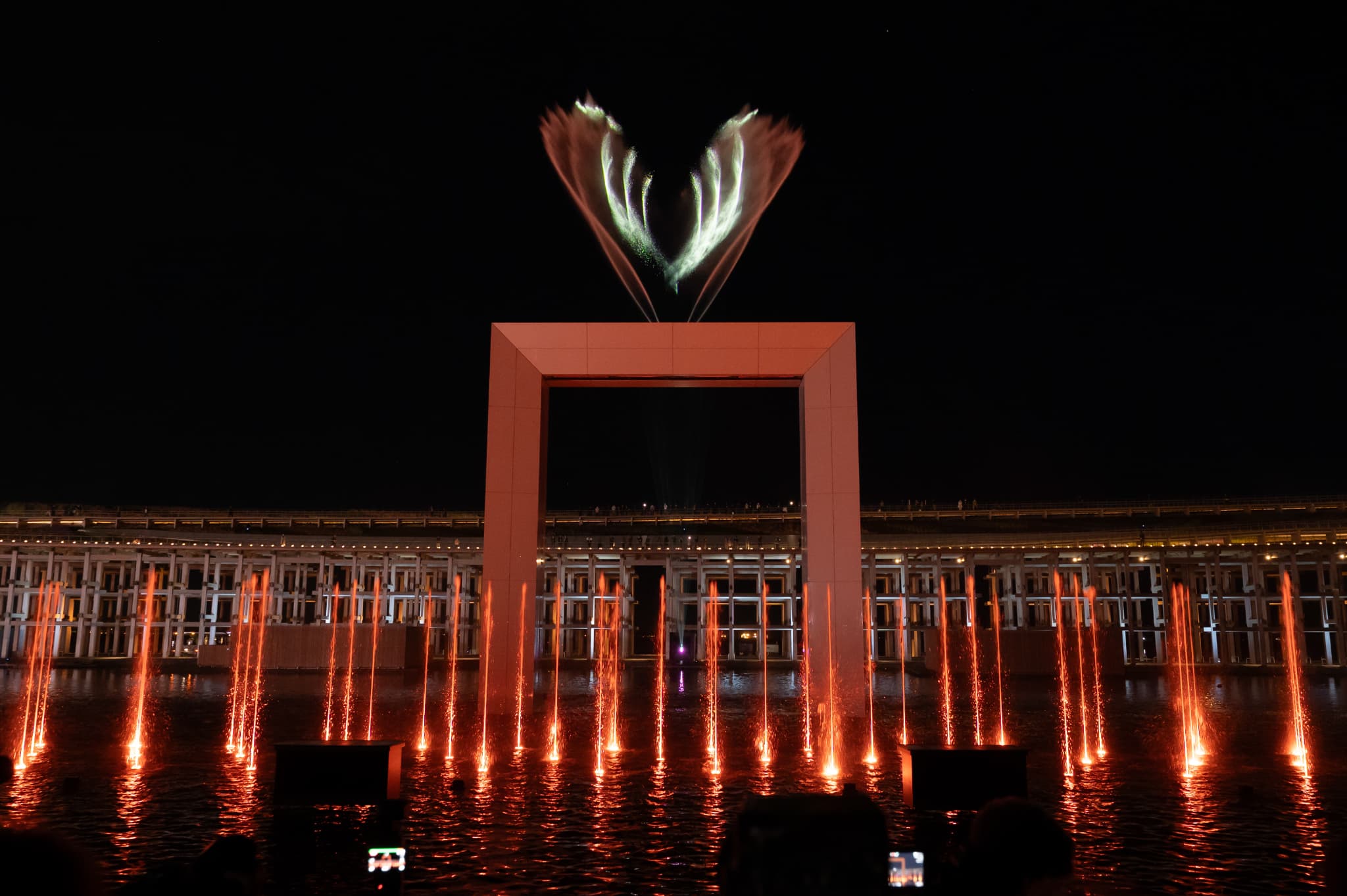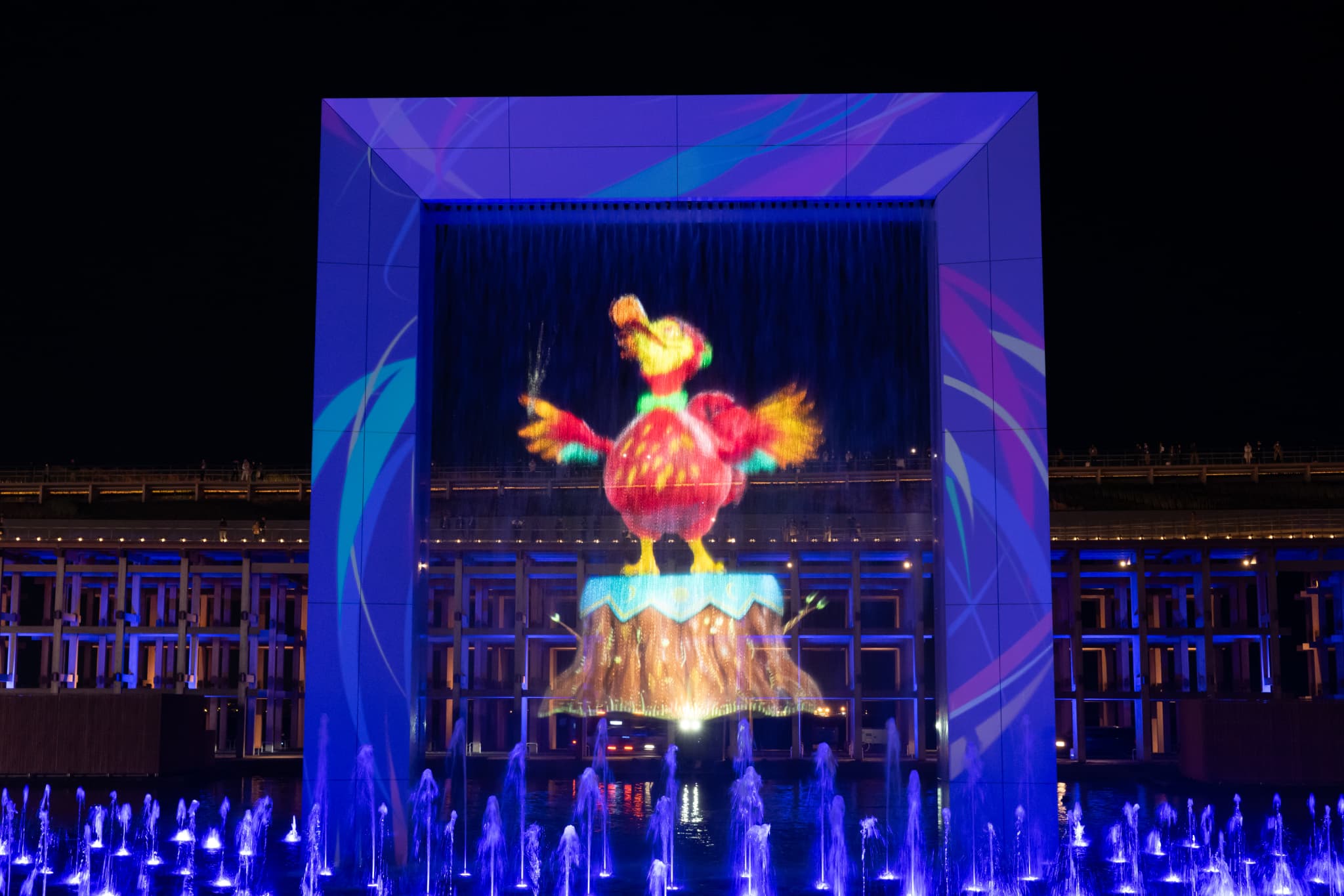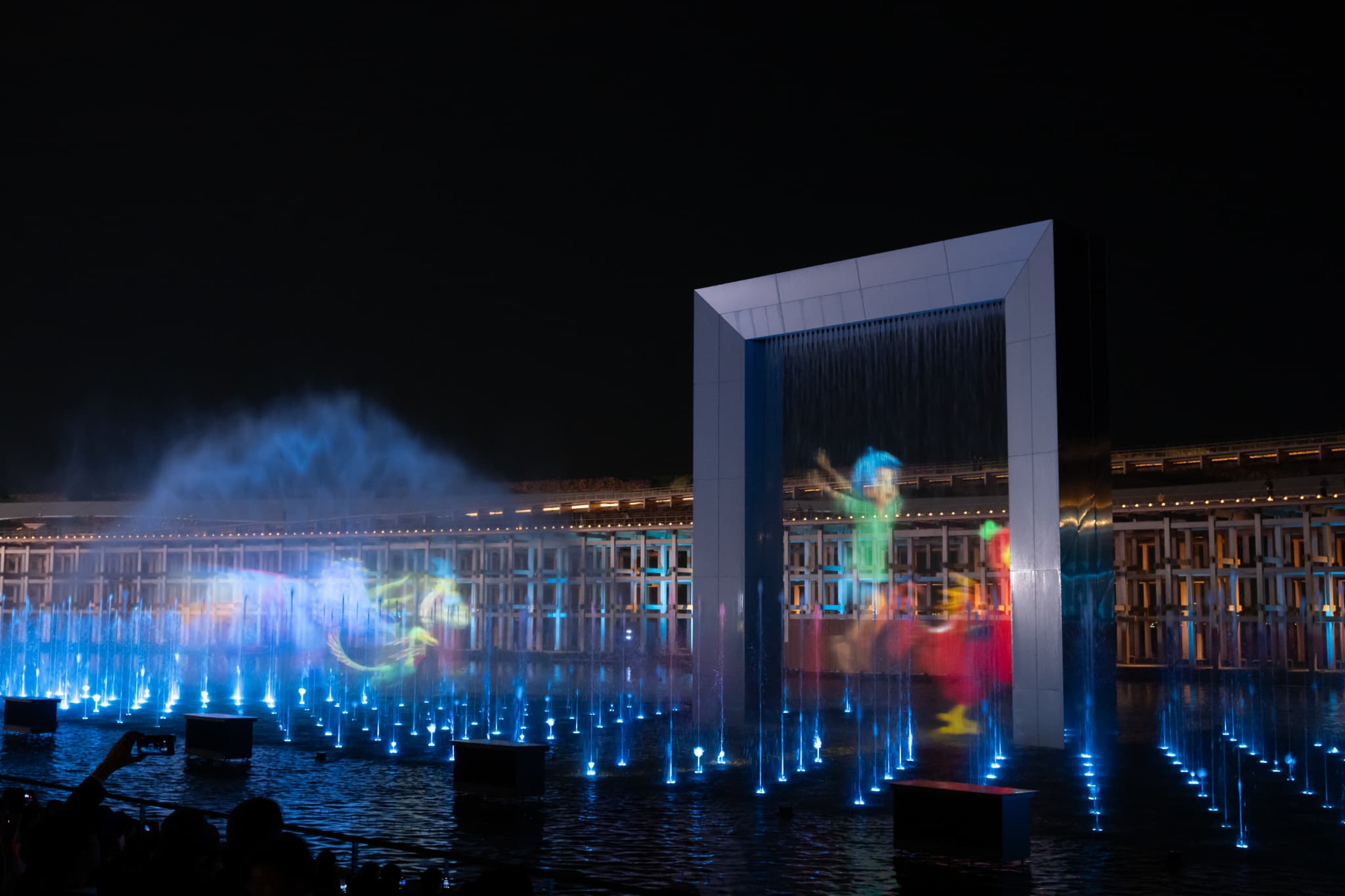 噴水装置の数はおよそ300基。水のスクリーンを生み出す中央の巨大オブジェは高さ18mにもおよび、常設かつ毎日開催される水上ショーとしては万博史上最大規模なのだとか!(※ショー実施エリア面積が最大)