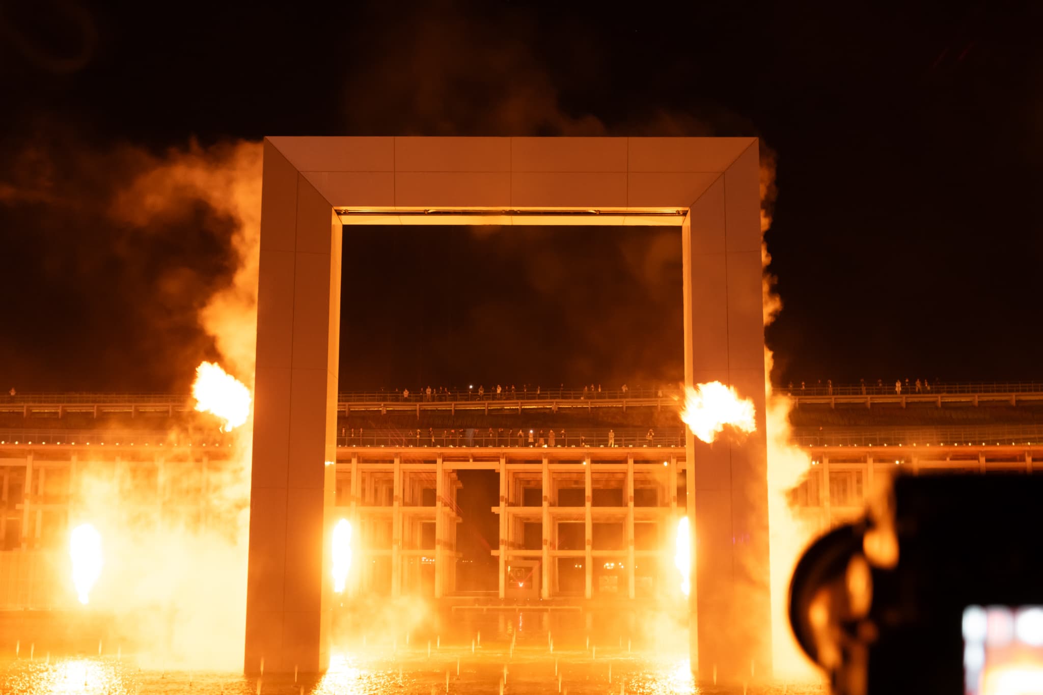 日没後には、会場全体が光と音、テクノロジーが織りなす幻想的な空間に変貌。「One World, One Planet.」では、音響やプロジェクションマッピング、ドローンなどが連動する壮大なショーが展開されます。
