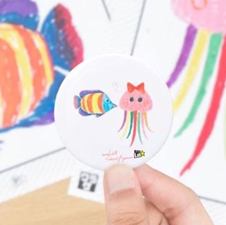 『お絵かき水族館』で描いた絵を、缶バッジにできる『缶バッジファクトリー』が展示会場出口付近にて開催されます(500円・税込)。