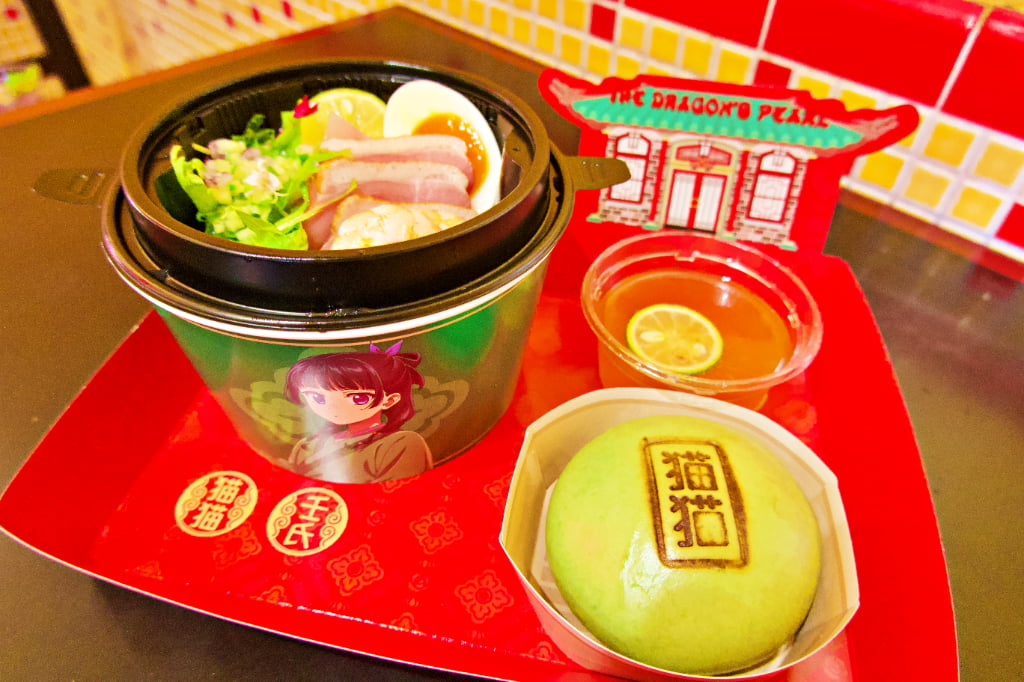 『薬屋のひとりごと』のオリジナルフードが味わえるのは、「ザ・ドラゴンズ・パール」。なかでも注目は、猫猫カラーの緑をベースにした「猫猫の彩りスダチ冷麺コンボ」です。