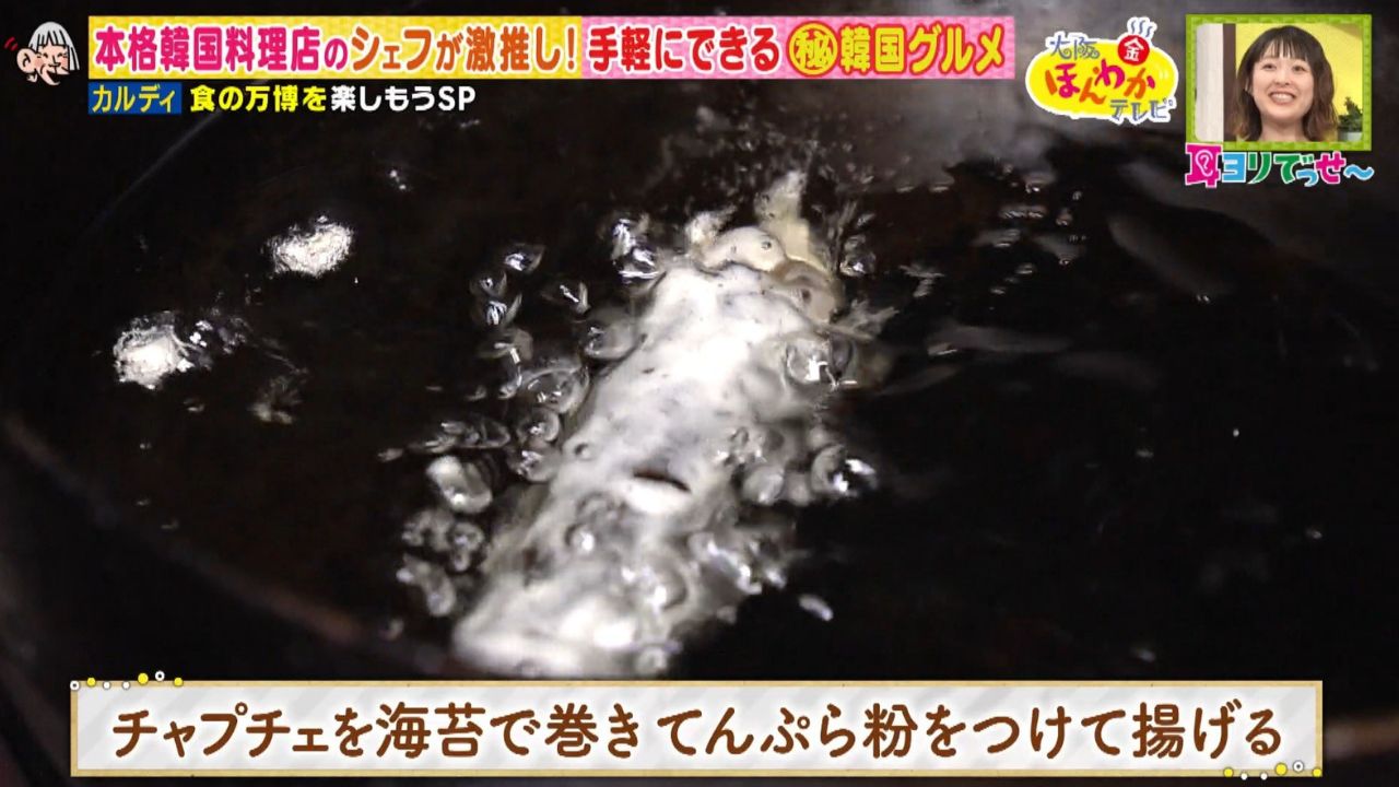 出来上がったチャプチェを海苔で巻き、天ぷら粉をつけて揚げれば「キムマリ」の完成! 先ほどのトッポギソースにつけても絶品です。
