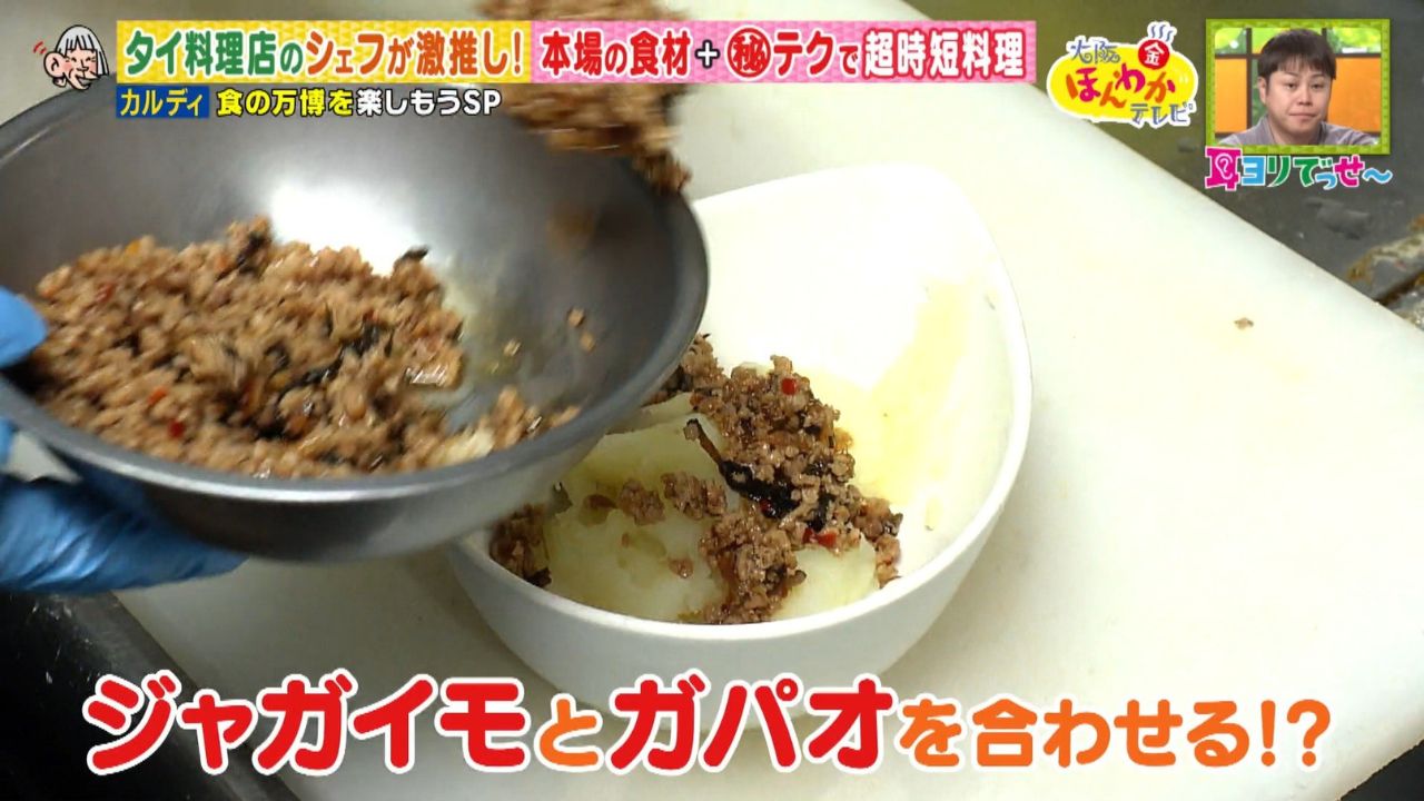 茹でたジャガイモとガパオを混ぜ合わせ、ライスペーパーで包んで揚げれば「ガパオ風揚げ春巻き」に。外はカリッと、中はもちっと。ガパオの辛さがジャガイモでほどよくマイルドになります。