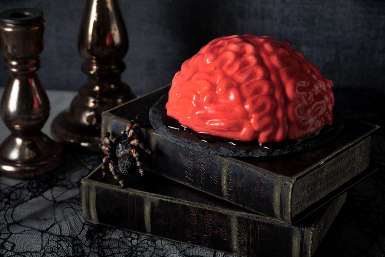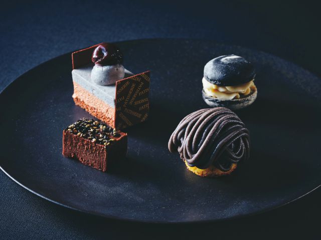 シャインマスカットや栗、洋梨など秋の味覚を贅沢に用い、フランス出身のパティシエが紡ぎだす優雅なケーキから、一瞬口にするのをためらうようなスイーツ&セイボリーまで勢ぞろい。漆黒に姿を変えた“闇落ち”スイーツに加え、目の前でシェフが仕上げるライブステーションではハンバーガーや目玉焼きの姿をした“欺き“スイーツも登場。