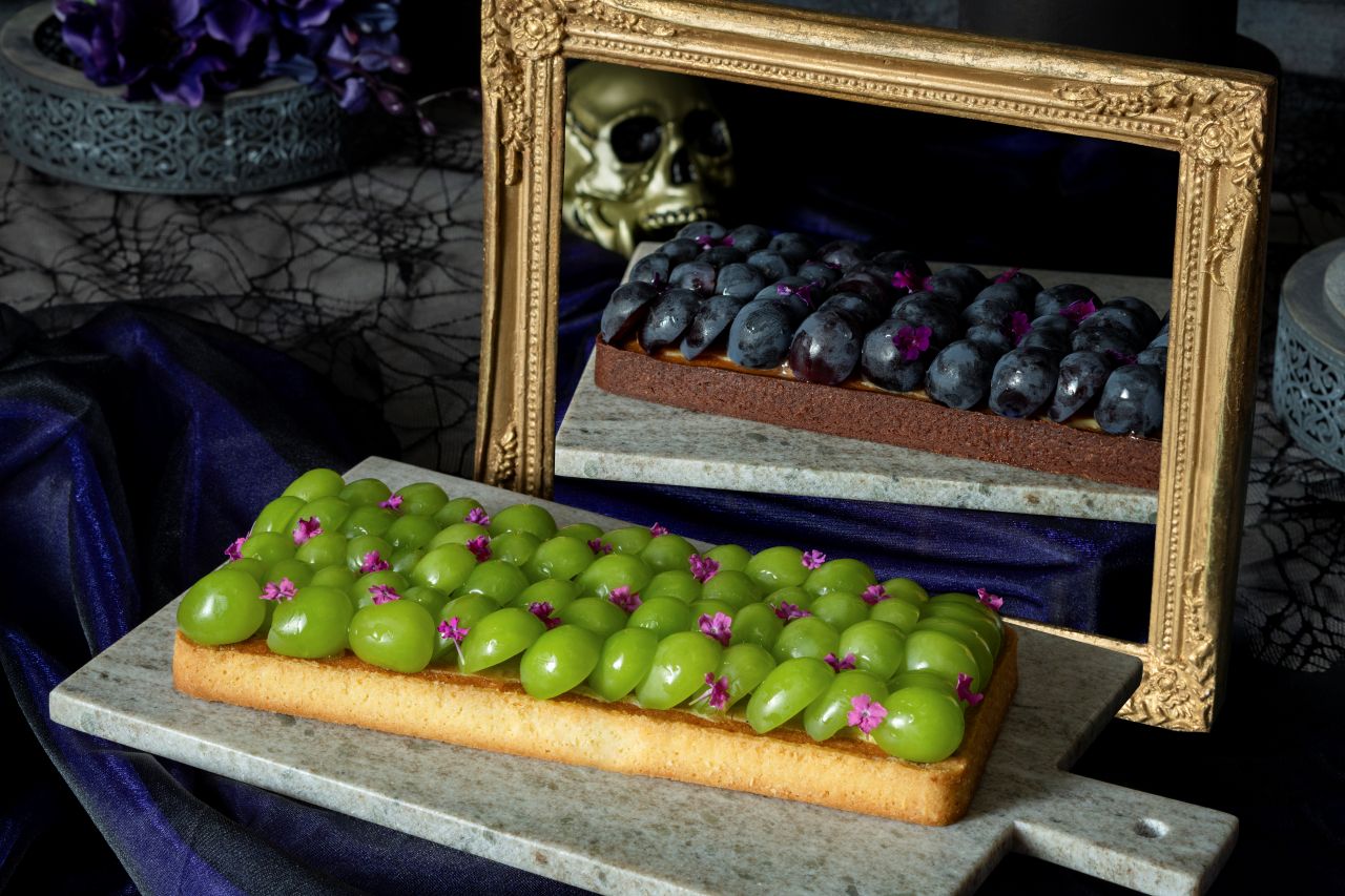 「ドリーミングフレッシュマスカットタルト」(手前)、「ナイトメアフレッシュグレープタルト」(鏡の中) -
