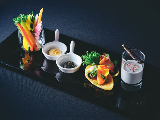 ごま尽くしのセイボリーも充実。「黒ごまと合鴨のオープンサンド」「白ごまとサーモンのオープンサンド」をはじめ、「彩野菜と黒と白の2種のごま味噌ディップ」「黒ごまヴィシソワーズ」「黒ごまパイスティック」までそろいます。