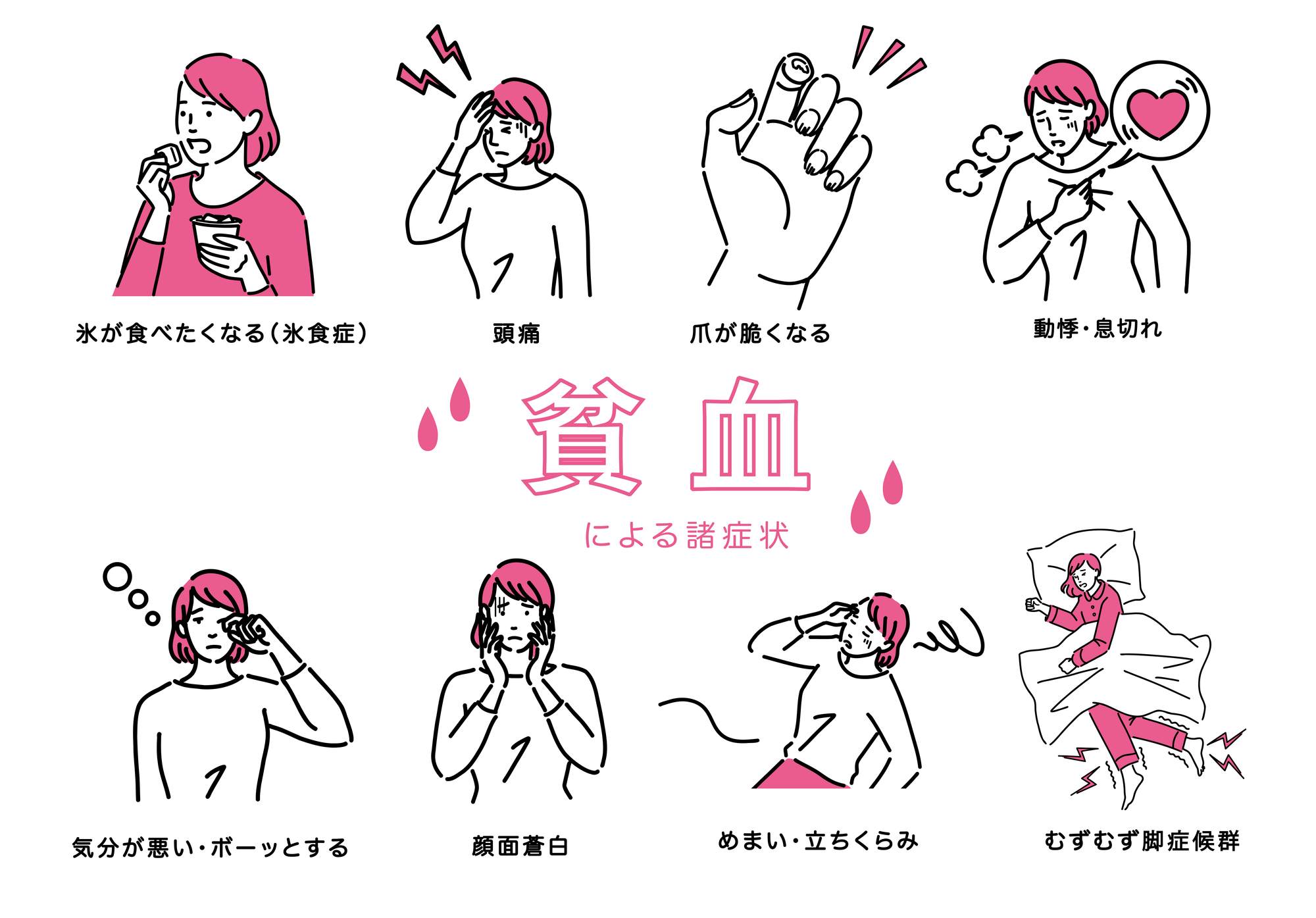 女性の場合、その原因の多くは月経による鉄分の喪失です。徐々に進行して慢性化するため、身体がその状態に慣れてしまい、自覚症状がないことも珍しくありません。
