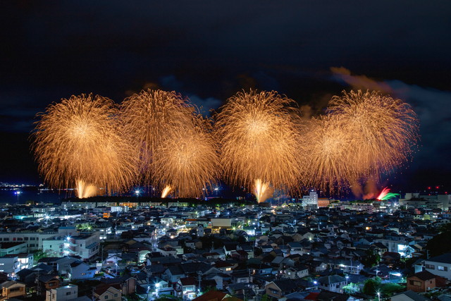 「弁慶まつり」と同時開催される「田辺花火大会」は、市政20周年を祝う20本のバースデー手筒花火でオープニングがスタート! 「ダイナミックシティTANABE」「ピースフル☆シャイン」「田辺ブルーシャワー」といったカラフルで美麗なテーマ花火に続く、巨大なしだれ紅白梅や梅酒・梅干し色の花火といった「梅三部作」は必見です。ラストには全長1,000メートルものワイドパノラマ花火を打ち上げます。