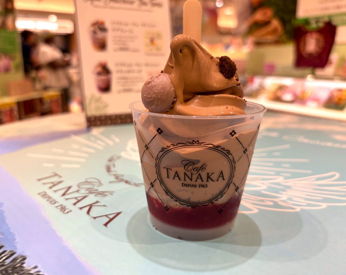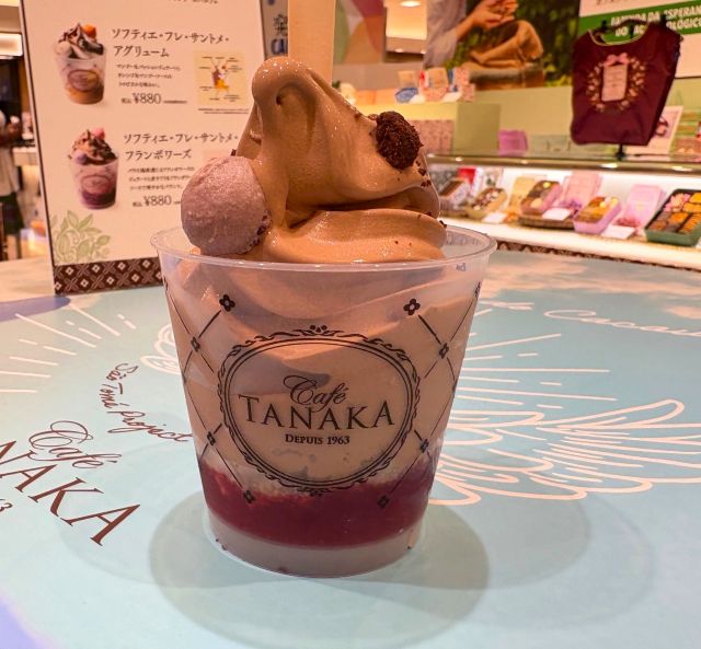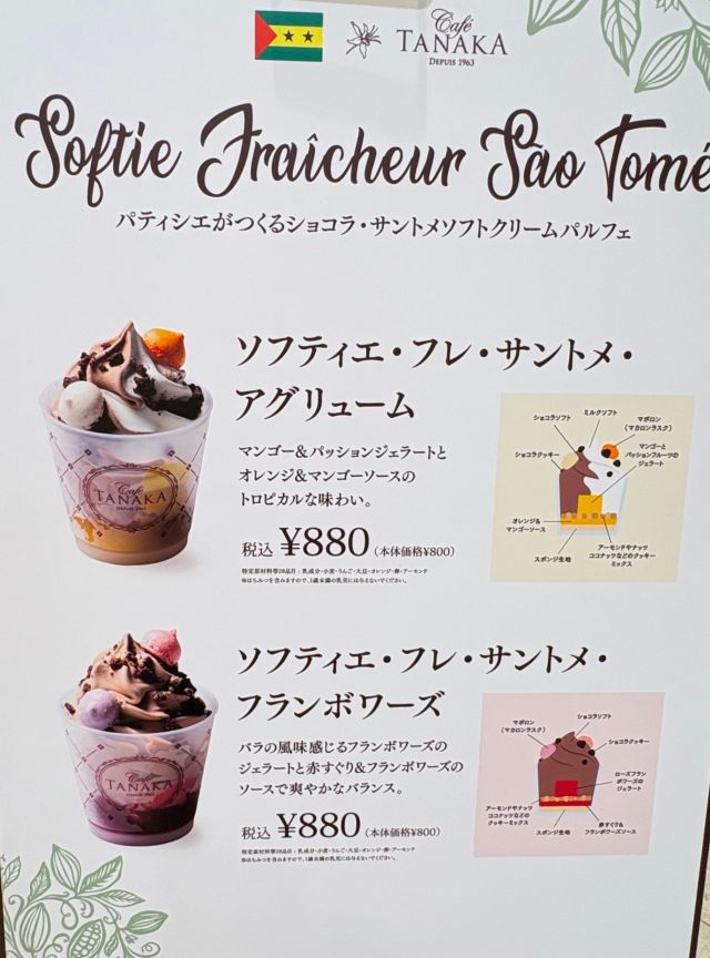 イートインで楽しめるのが、絞りたて「ソフティエ・フレ・サントメ」。ショコラ・サントメのソフトクリームが、「フランボワーズ」と「アグリューム」のパルフェ仕立てで提供されます。
