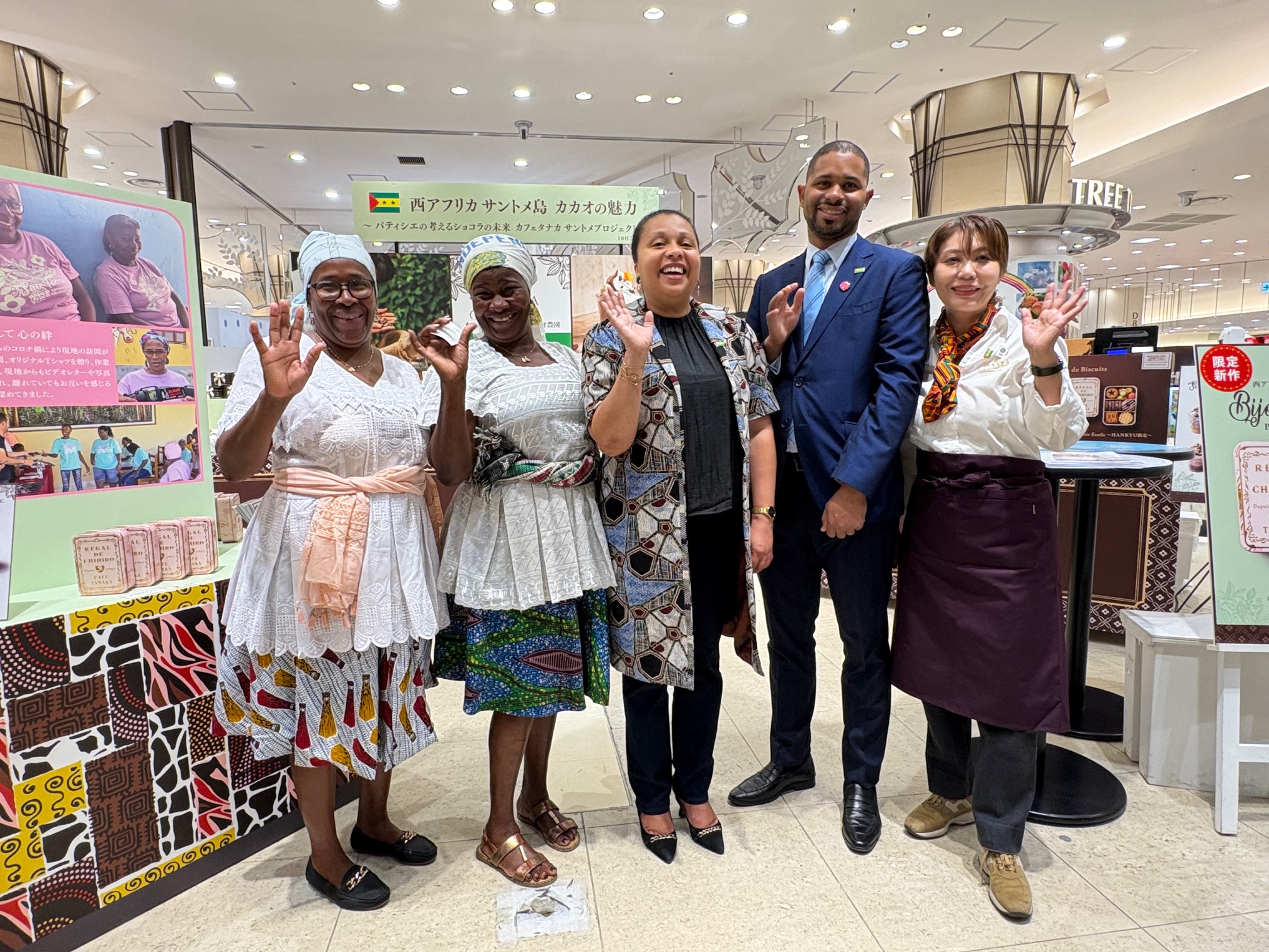 会場では、パティシエールの田中千尋さんが「多くの方にサントメを知っていただき、カカオ農園や女性の自立などを考えていただくきっかけになれば」と挨拶。サントメの観光大臣からも「未来にむけて女性が自立できるよう、これからも互いに助け合うよい関係をつないでいきましょう」と温かなメッセージが寄せられ、州知事やカカオの生産に携わるイグナシアさん、ファティマさんも参加して、和やかなオープニングとなりました。