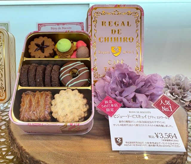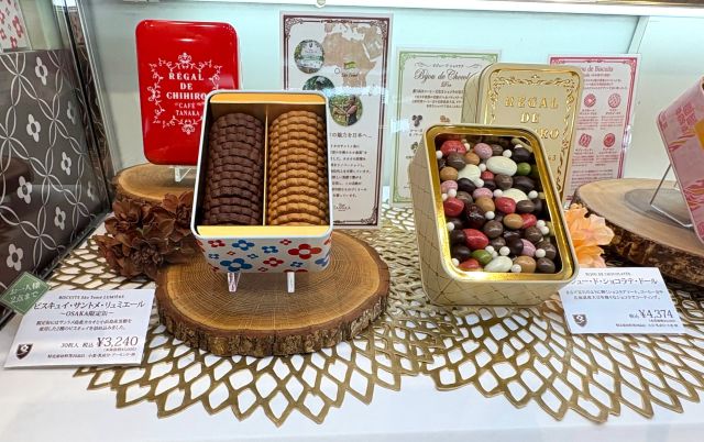 今回の目玉は、新作5種を詰め合わせた「ビジュー・ド・ビスキュイ プティエトワール〜HANKYU限定〜」(3,564円)。サントメ政府代表から田中さんへ贈られたキルト柄をデザインにあしらった、特別感あふれる缶です。