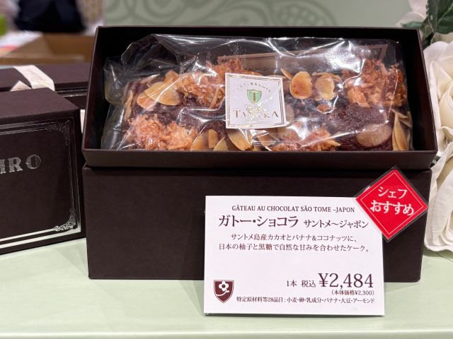 シェフおすすめの「ガトー・ショコラ サントメ~ジャポン」は、サントメ島産カカオとバナナ&ココナッツに、柚子と黒糖で自然な甘さが感じられるケークです。