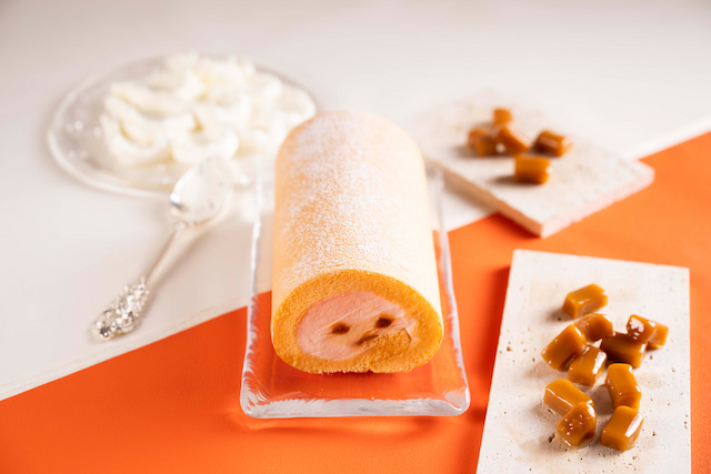 関東限定で登場したのは、なめらかなプリンとコクのあるクリームに色とりどりのフルーツを加えた「プリン・ア・ラ・モードロール」。ロール生地に添えたカラメルソースをプラスすると、ほろ苦く香ばしい風味が加わります。レトロで華やかなロールケーキで手土産にもぴったりです。