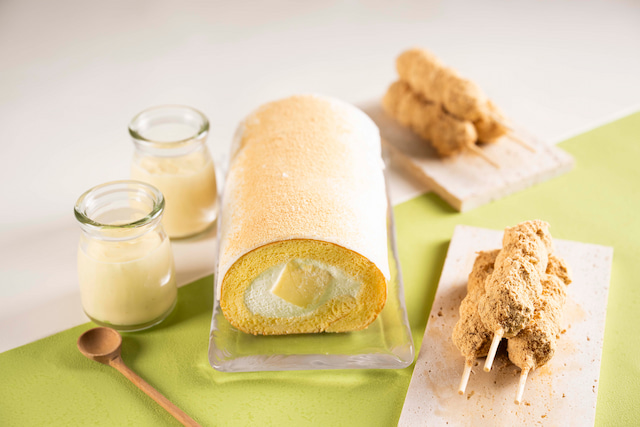 ジャージー牛乳のプリンを包んだロールケーキに、もっちり食感の求肥をのせてきな粉をふりかけた岡山限定「きび団子とジャージー牛乳プリンロール」。プリンの濃厚なコクと、ほのかなきび団子の風味を同時に楽しめます。