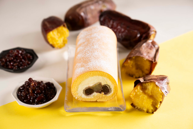 もちもち食感の求肥に、ほくほく甘いサツマイモの甘露煮と炊き上げたつぶ餡を、モンシェールオリジナルクリームにしのばせた博多限定ロールケーキ。熊本名物いきなり団子の素朴でやさしい味わいを感じられます。