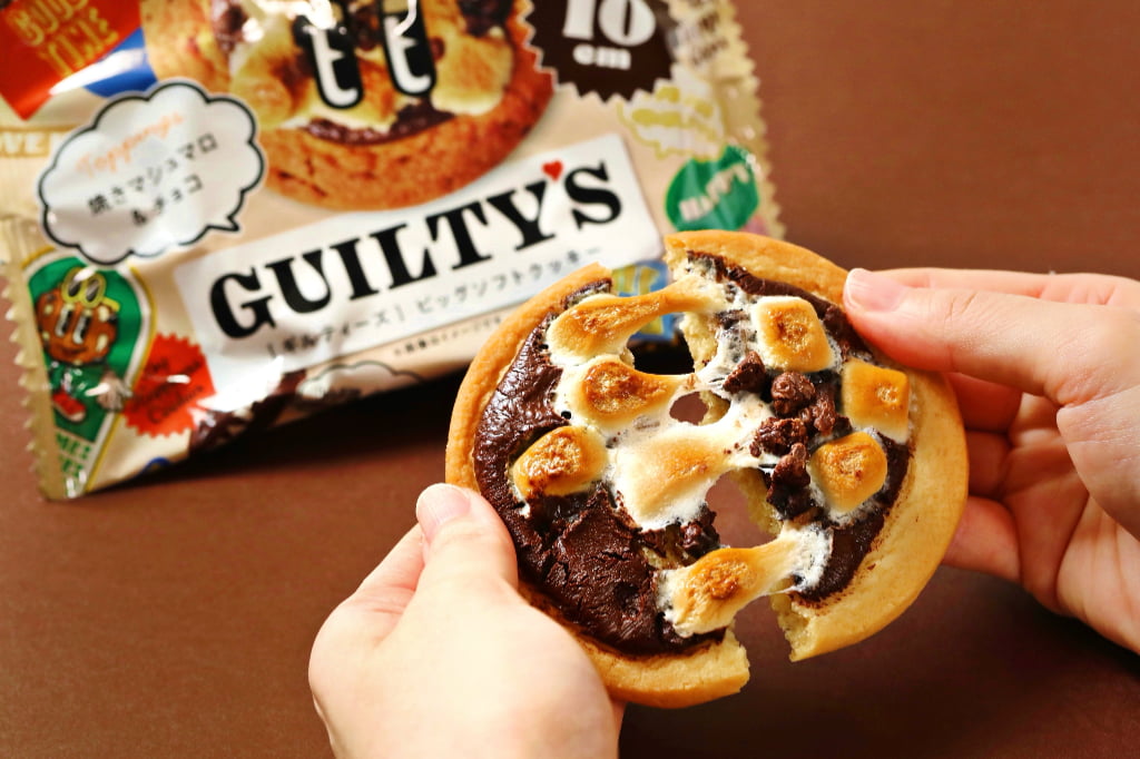 しっとり食感のクッキー生地に、チョコレートのザクザク感とのび~るマシュマロを合わせた「ギルティーズクッキー 焼きマシュマロ&チョコ」と、甘酸っぱいイチゴキャンディと焼きマシュマロをトッピングした「ギルティーズクッキー 焼きマシュマロ&ストロベリー」の2種がラインナップします。