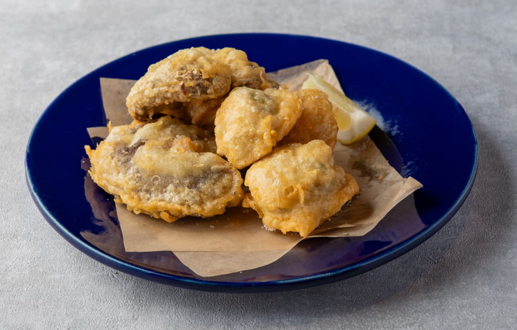 まず注目は、明日香村産の里芋を使った「里芋ゼッポリーニと原木しいたけのフリット」。吉野町の肉厚でうまみの濃い原木しいたけのフリットが組み合わされており、シンプルに塩とレモンで味わうのがおすすめです。