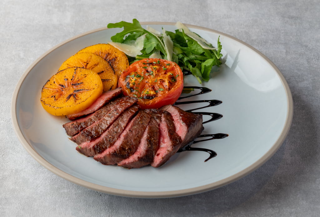 お肉料理からは、奈良のブランド牛「大和牛」を使用したタリアータが登場。バターでソテーした明日香村の柿が添えられています。