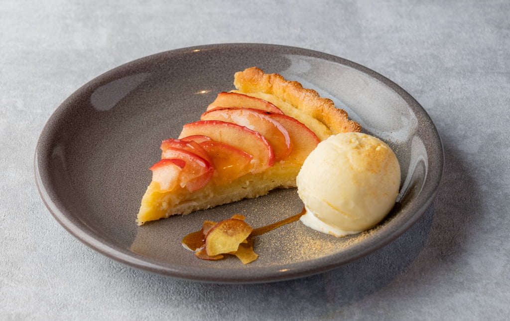 デザートは、強い甘みとねっとり食感の紅はるかとしゃっきり甘酸っぱい林檎を合わせた米粉のタルトを。植村牧場の牛乳を加え、コクのあるフィリングに仕上げられています。