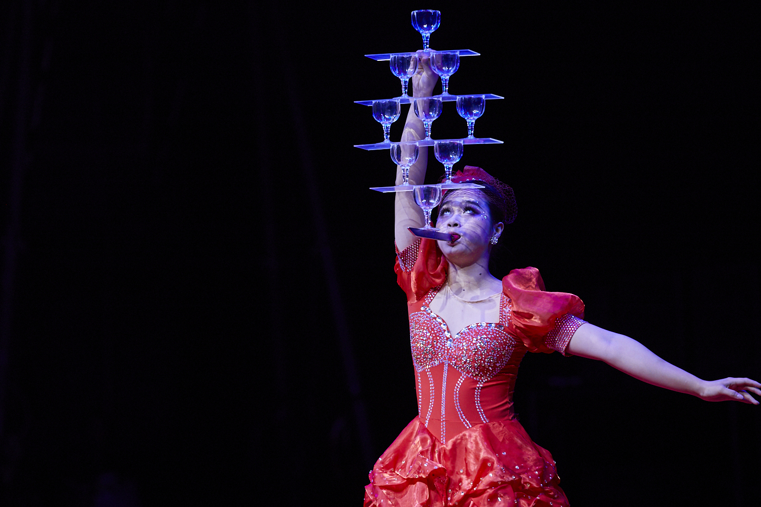 口に咥えたソード(剣)の先に積み上げられているのはグラス。それだけでも驚きなのに、なんとそのまま空中へ…!?