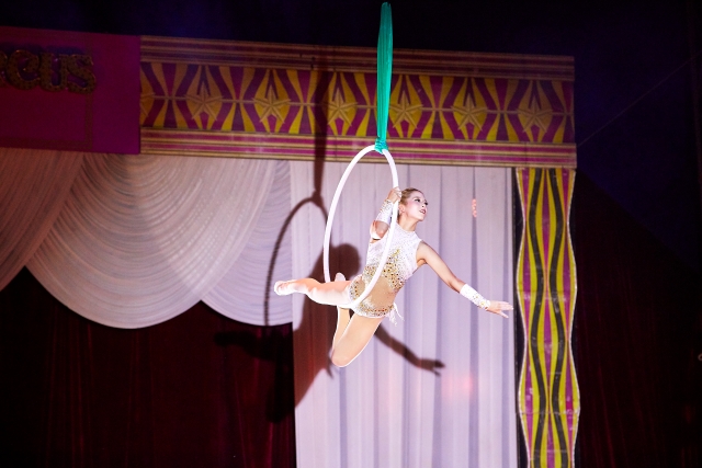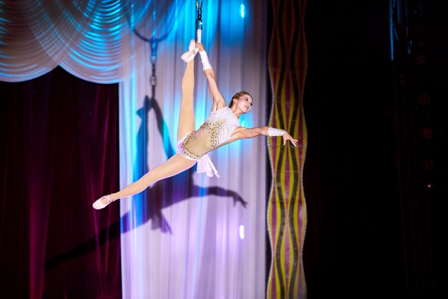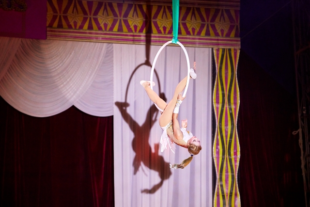 フープを使った空中演舞。足の甲だけで引っかけてポーズを決めるなど、その華麗さと身体能力に思わずうっとり。