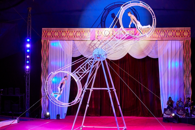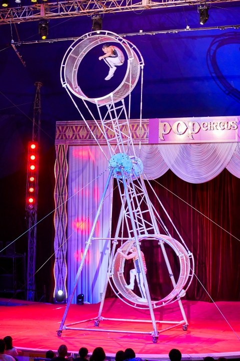 巨大な車輪のようなホイールがぐるぐると回転するデスホイール。パフォーマー2人が勢いよく回るホイールの中を歩いたり跳んだり、寝そべったり。観客側が手に汗握る、スリル満点の危険なパフォーマンス。