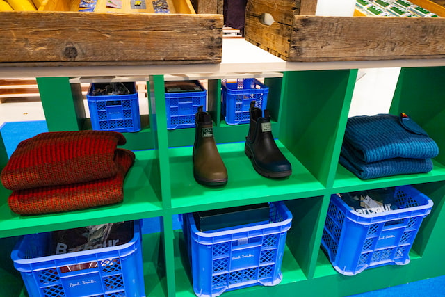 今回のリリースに合わせ、「ポール・スミス 大阪店」は全国で唯一、大規模な店内装飾を実施。エントランスすぐの中央スペースにコレクションをディスプレイし、訪れる人を迎えます。