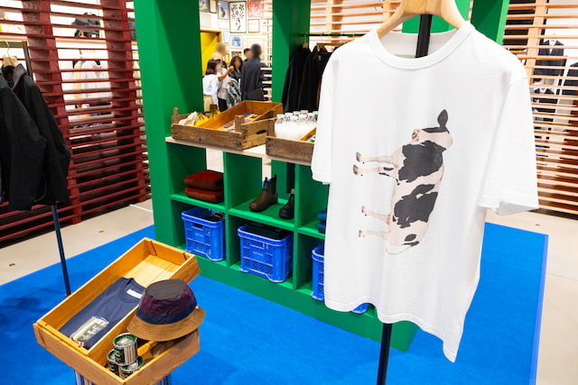 コラボアイテムについてジュニアさんは、「釣りやキャンプなどのアウトドアにもぴったり。ガシガシ着られる“よそ行き”」とコメント。 裏地の牛プリントを見て「普通は牛柄にするところが、牛そのもの!」と笑いを誘います。
