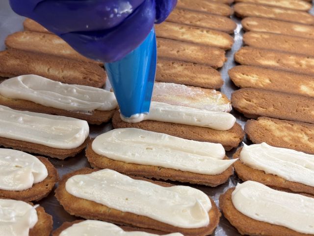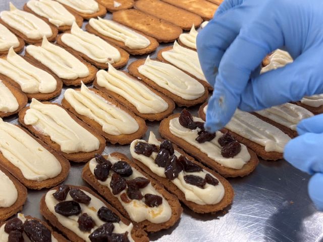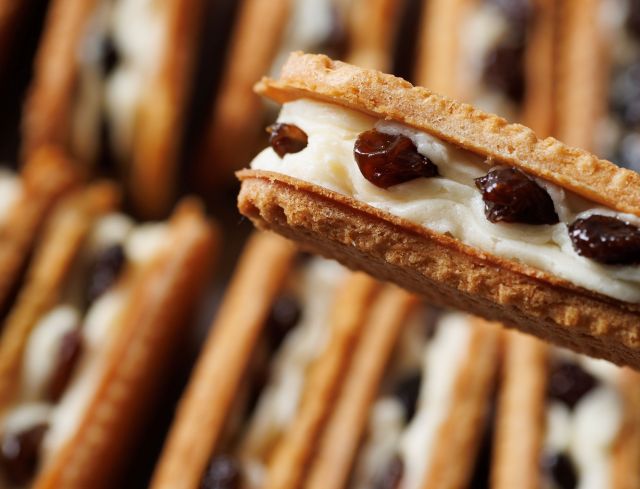 手焼きのクッキー生地にバタークリームを絞り、レーズンを並べてサンドするまで、すべての工程を手作業で行います。手作業だからこその味わいや食感を楽しめるのがポイント。