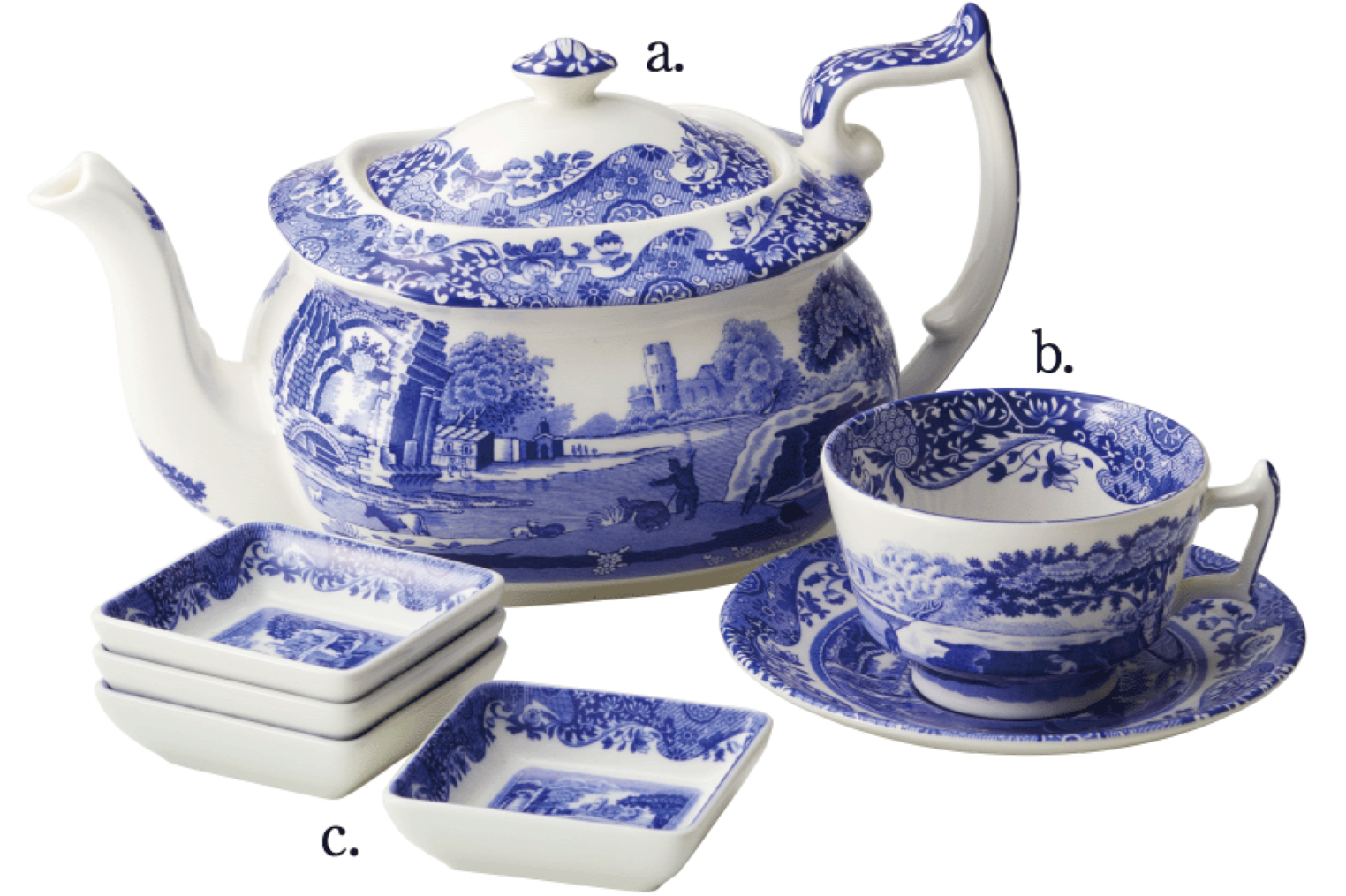 「スポード」の「ティーポット」 (44,000円)、「カップ&ソーサー」 (11,000円) ※英国製、「ミニ正方形プレート」(各2,200円) ※中国製。すべて後半のみ、9階 祝祭広場にて販売