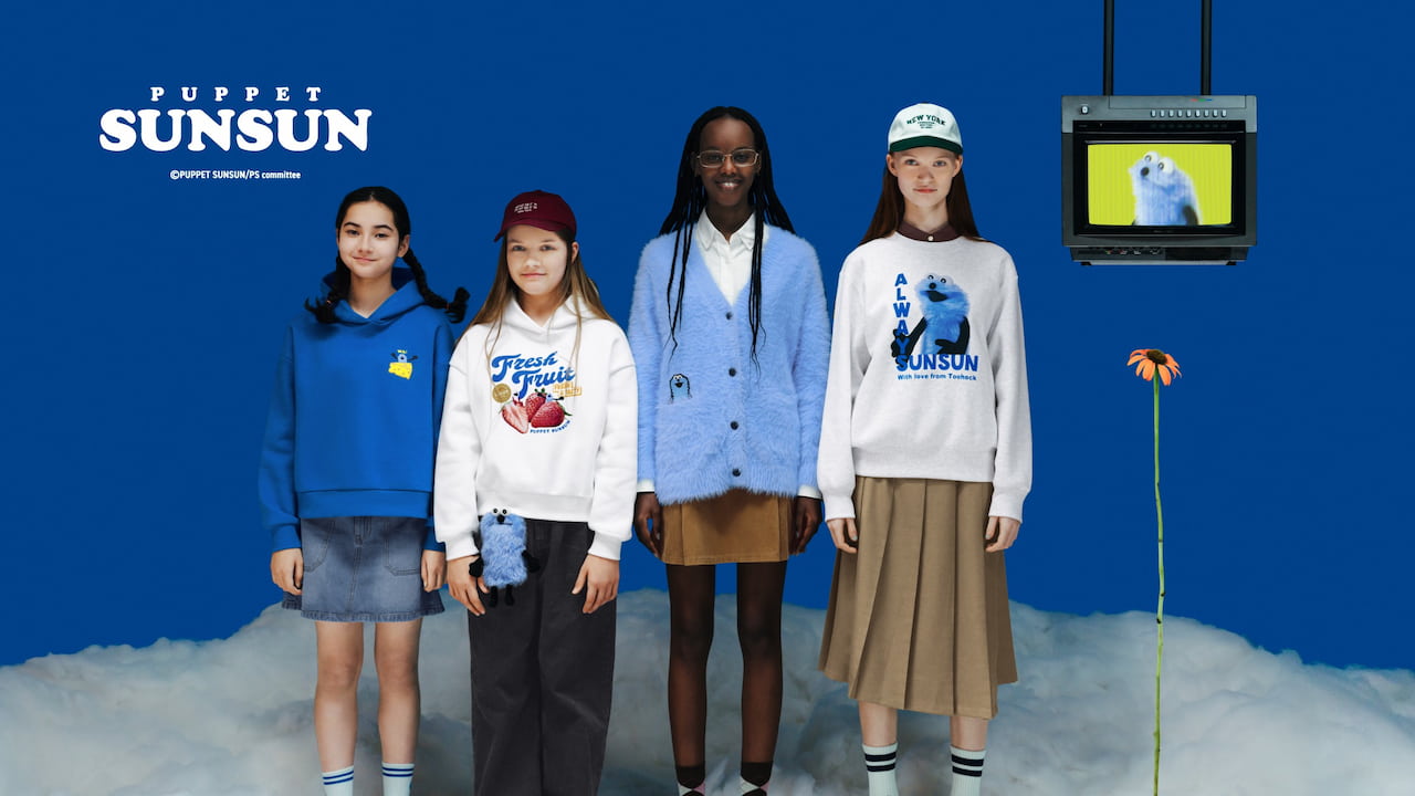 SNSで大人気の「パペットスンスン」と「ジーユー」のコラボコレクションは、スンスンカラーのブルーを基調にした、レトロでポップなムードが魅力。ふわふわの手ざわりに癒やされる、キュートな小物も見逃せません。