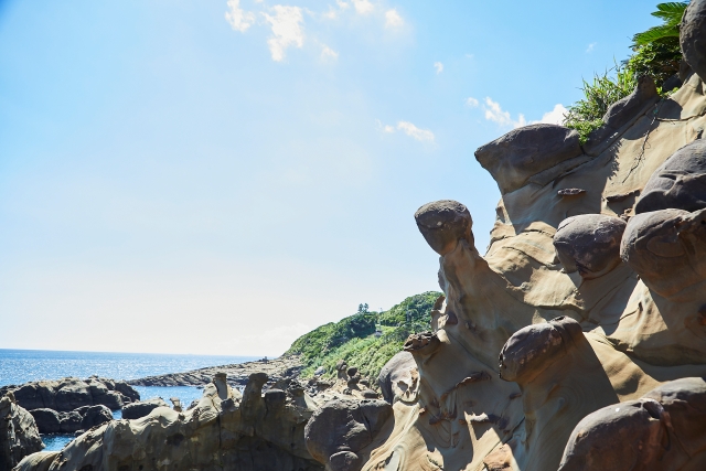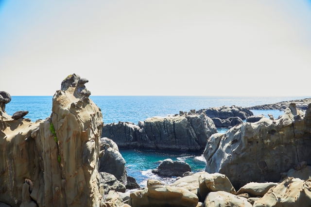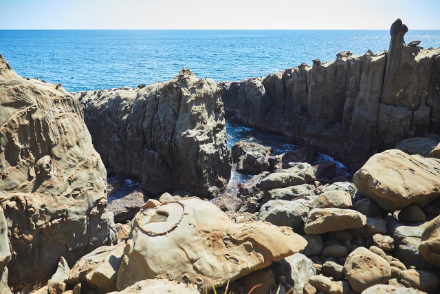 日向灘の雄大な景色に見とれていると、神宮周辺の壁面から突出した不思議なシルエットの岩々が目に留まります。これは長い年月をかけて形成された炭酸カルシウムの塊で、ところどころに空いた丸い穴は、その岩がコロンと落ちた痕跡なのだそう。自然が作り出した造形美に、時の流れと神秘を感じます。