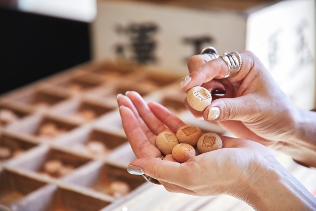 男性は左手、女性は右手で願いを込めて「運玉」を投げよう。 -
