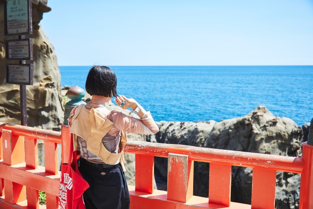 古事記の中にも記述があり、地元民から「鵜戸さん」と呼ばれ親しまれる「鵜戸神宮」は、海に突き出た岬の洞窟内に赤塗りの本殿が鎮座する珍しい神社。神秘的な雰囲気が漂う洞窟内にある「お乳岩」から滴り落ちる「お乳水」で作られる「おちちあめ」は、赤ちゃんがよく育つことを願う参拝客が買い求める銘菓として人気。安産・育児・縁結びなどの御利益があるとされています。