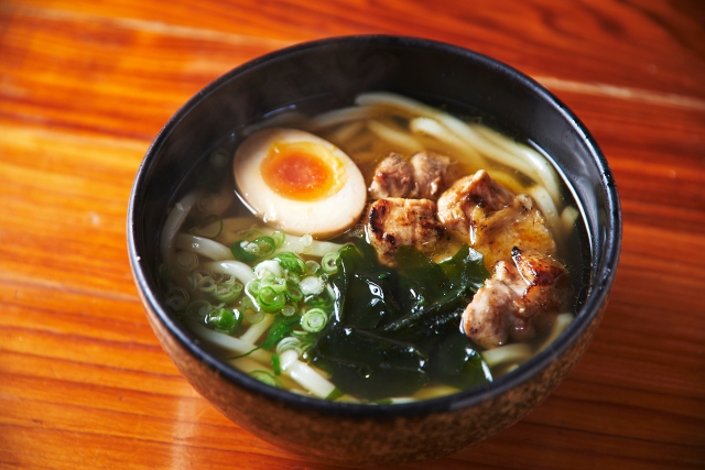 いち押しは、エビの天ぷら、肉、わかめ、きつね、とろろ、卵焼きをぜいたくにトッピングした「豊味うどん」。本店を構える小林市のお米を使ったおにぎり付きです。毎朝仕込む自慢のうどんは、オーダーごとに生麺から茹で上げることで、程よいコシともっちりとした食感に。鰹節×昆布をベースに、イリコの風味をほんのりプラスしたつゆは、奥行きのある旨みが身体にじんわり染み渡ります。