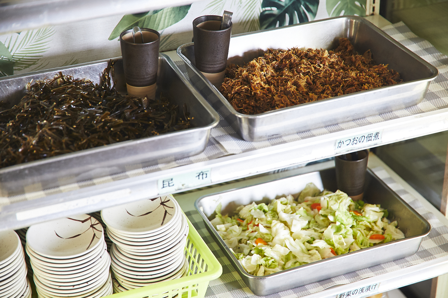 セルフサービスの自家製浅漬け、昆布、カツオの旨煮を用意。 -