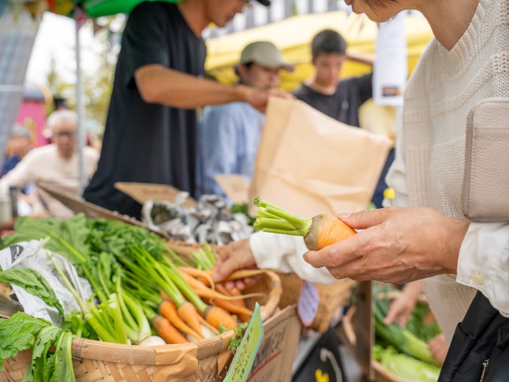 亀岡市は「賀茂なす」や「まる曽玉ねぎ」、千枚漬けの材料となる「聖護院かぶ」といった京野菜の生産も盛んで、まさに“京の台所”。会場内にある「ファーマーズマーケット」には地元農家が丹精込めて育てた旬の新鮮野菜が並び、生産者に直接、野菜へのこだわりやおいしい食べ方を聞くことができます。