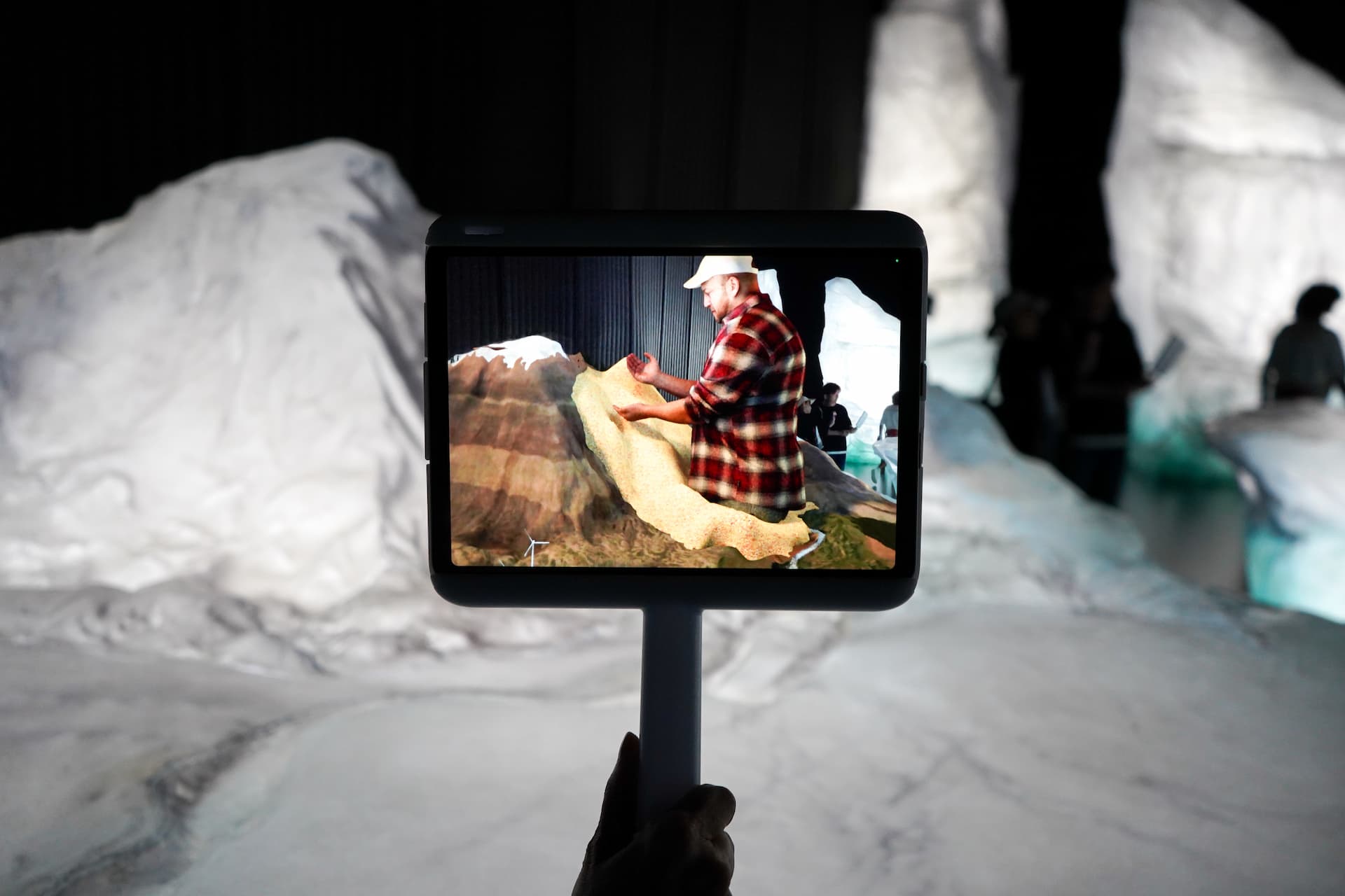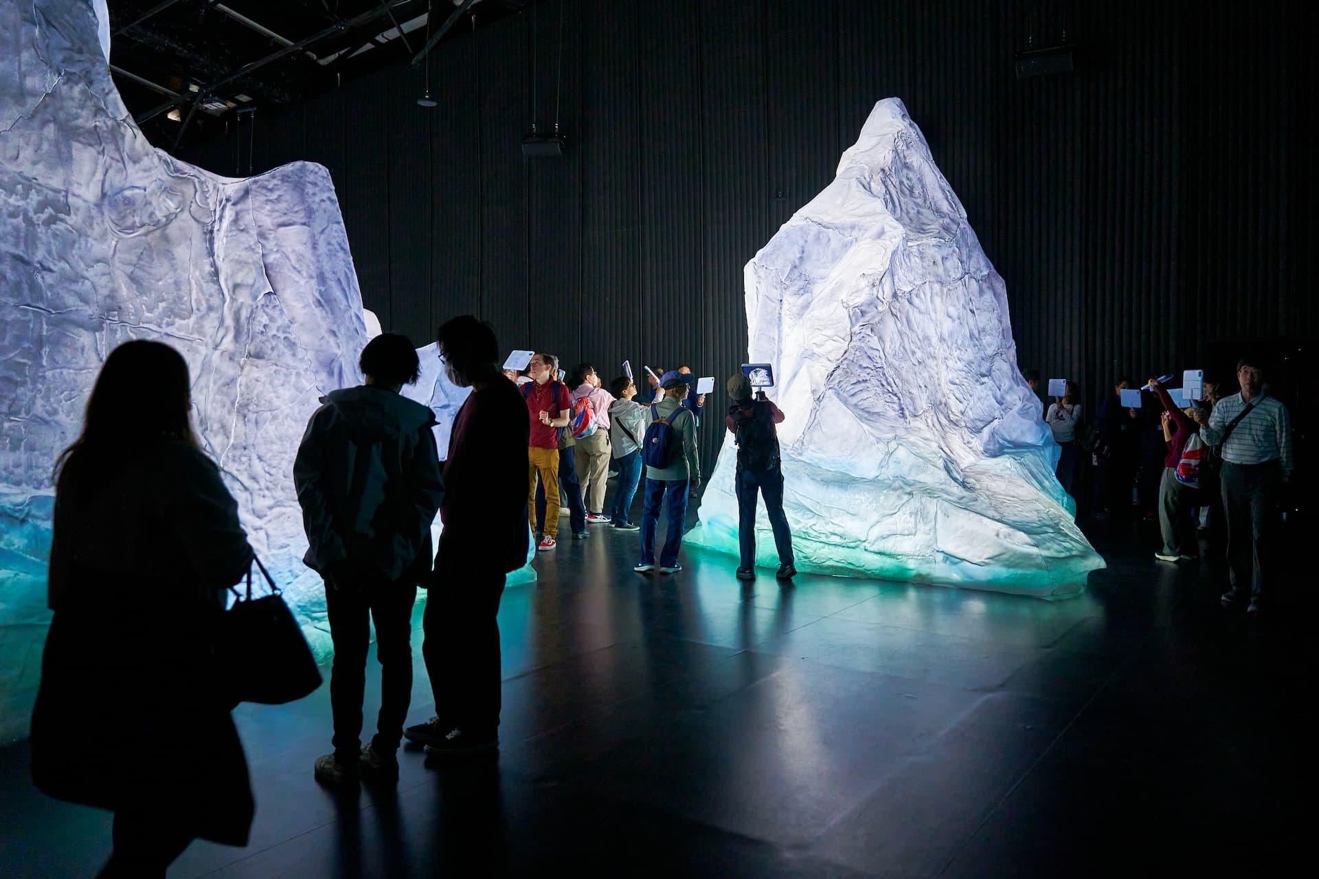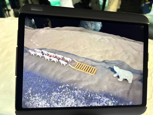 館内では9つの氷河をめぐりながら、来場者一人ひとりに手渡されるタブレットをかざすと、カナダの美しい自然や人々、伝統、最先端技術が映像として浮かび上がります。まるで宝探しのように進む体験型展示で、子どもから大人まで夢中に。