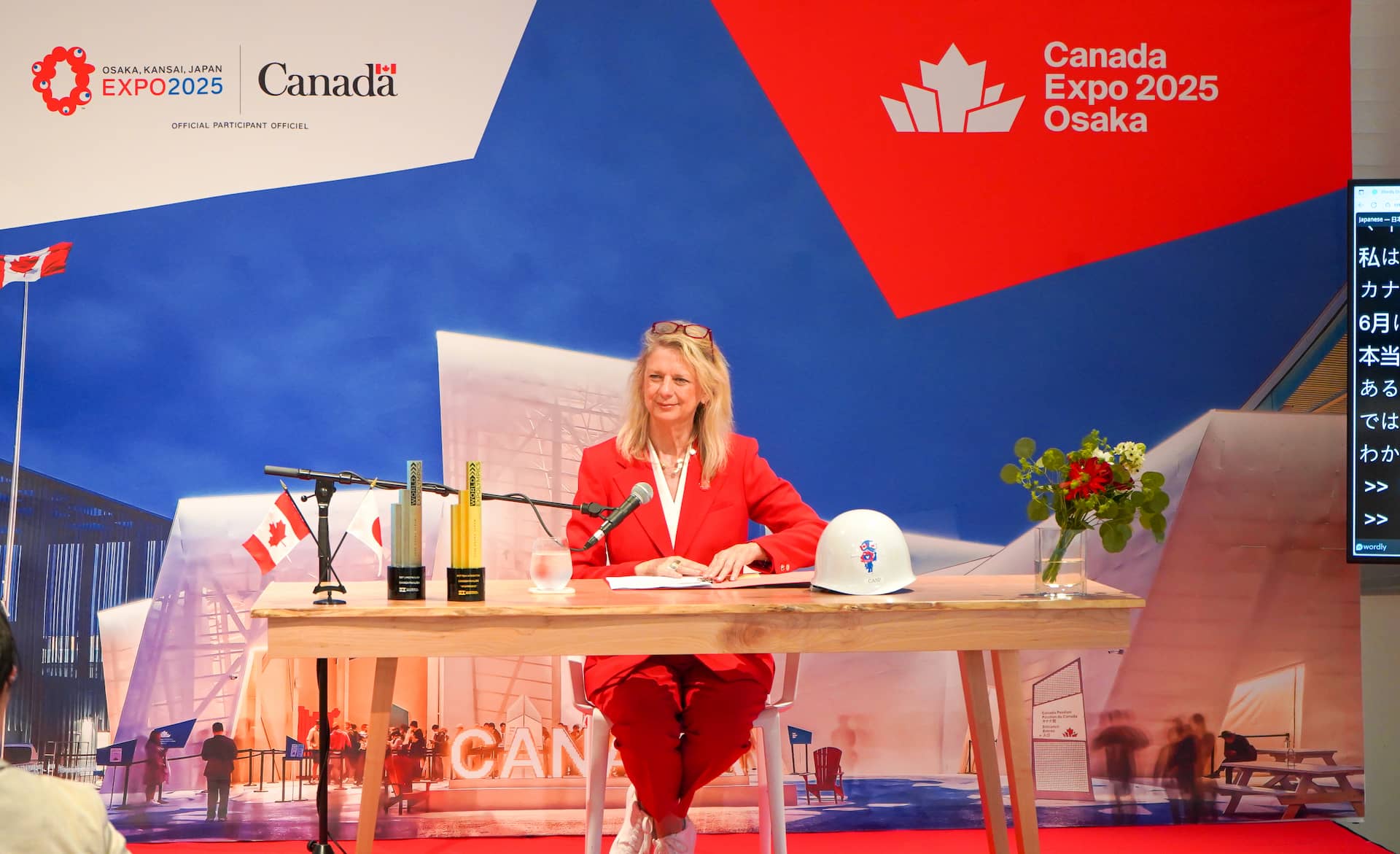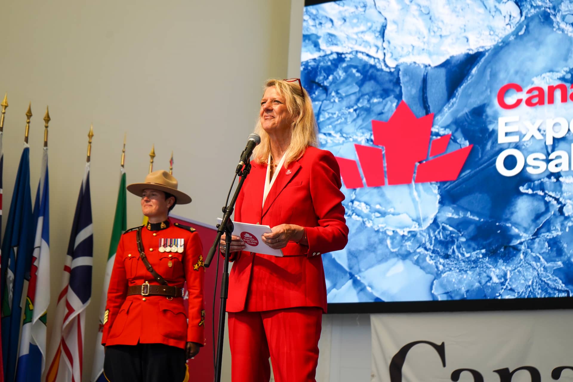 「O‘Canada Okini ~大阪・関西万博へ感謝を~」のオープニングセレモニーに先駆けて⾏われたメディア向けプレゼンテーションでは、カナダパビリオン政府代表のローリー・ピーターズさんが登壇。カナダパビリオンを盛り上げたすべての人への感謝の言葉と、取り組みの成果が紹介されました。