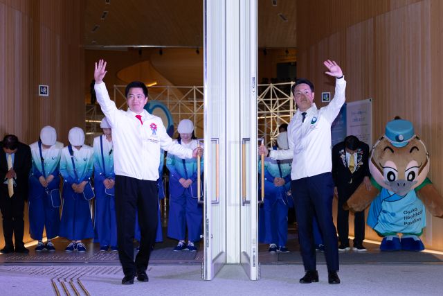 「大阪ヘルスケアパビリオン」へ入館する“最後の来館者”を、吉村知事、横山市長、西澤館長の3名がハイタッチでお出迎え。
