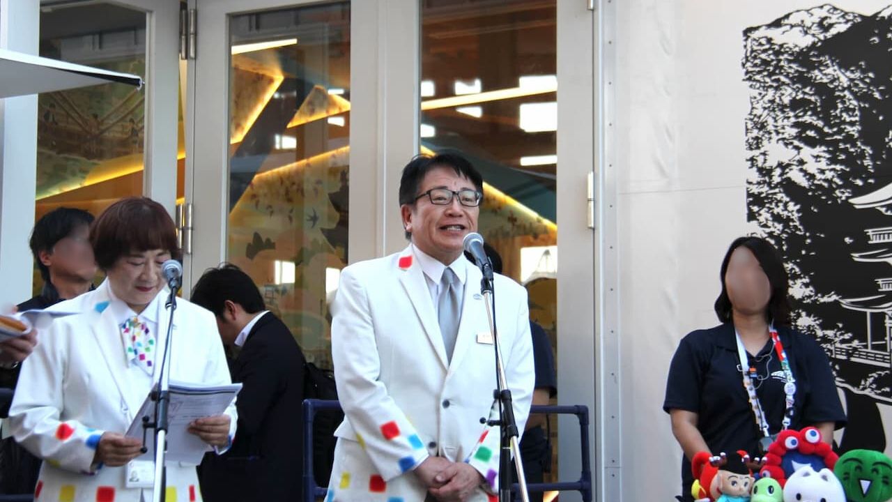 最後に登壇したのは、関西広域連合議会の渡辺邦子議長。関西パビリオンのユニフォームに憧れをいだいていたそうで、この日は自作のユニフォームを着用。また、関西パビリオンを盛り上げた館長へ自らの手で“感謝のメダル”を贈るサプライズ演出に、会場は大きな拍手と笑顔で包まれました。