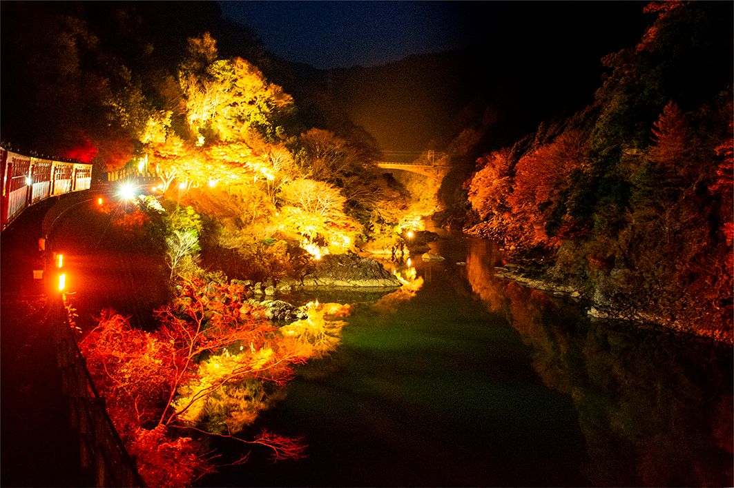 本イベントでは、“光の幻想列車”と題し、沿線を熟知した社員自らが風景を演出。約1,000台の照明に照らされる美しい紅葉、色彩豊かな光によってさらに神秘的な姿を見せる山々、きらめく川面など、期間中しか見られない幻想的な光景が広がります。