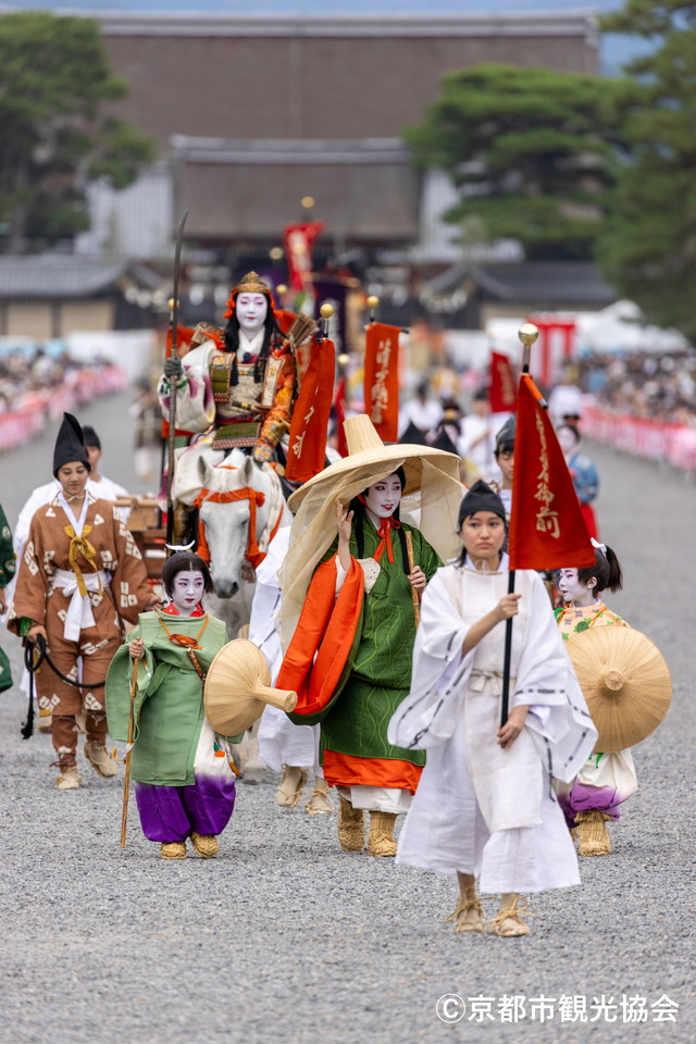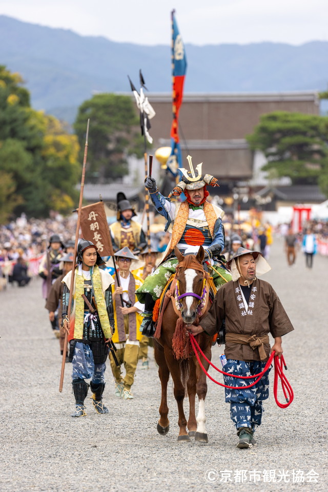 平安遷都1100年を記念して1895年に始まった「時代祭」は、平安神宮の大祭です。明治維新時代から平安京の造営された延暦時代にまでさかのぼりながら、約2,000人の市民がさまざまな時代装束に身を包んで練り歩く行列はまさに圧巻! 西郷隆盛や織田信長、清少納言など各時代で活躍した人物を眺めたり、美しい衣装に目を奪われたりしているうちに、2時間はあっという間に過ぎてしまいそう。