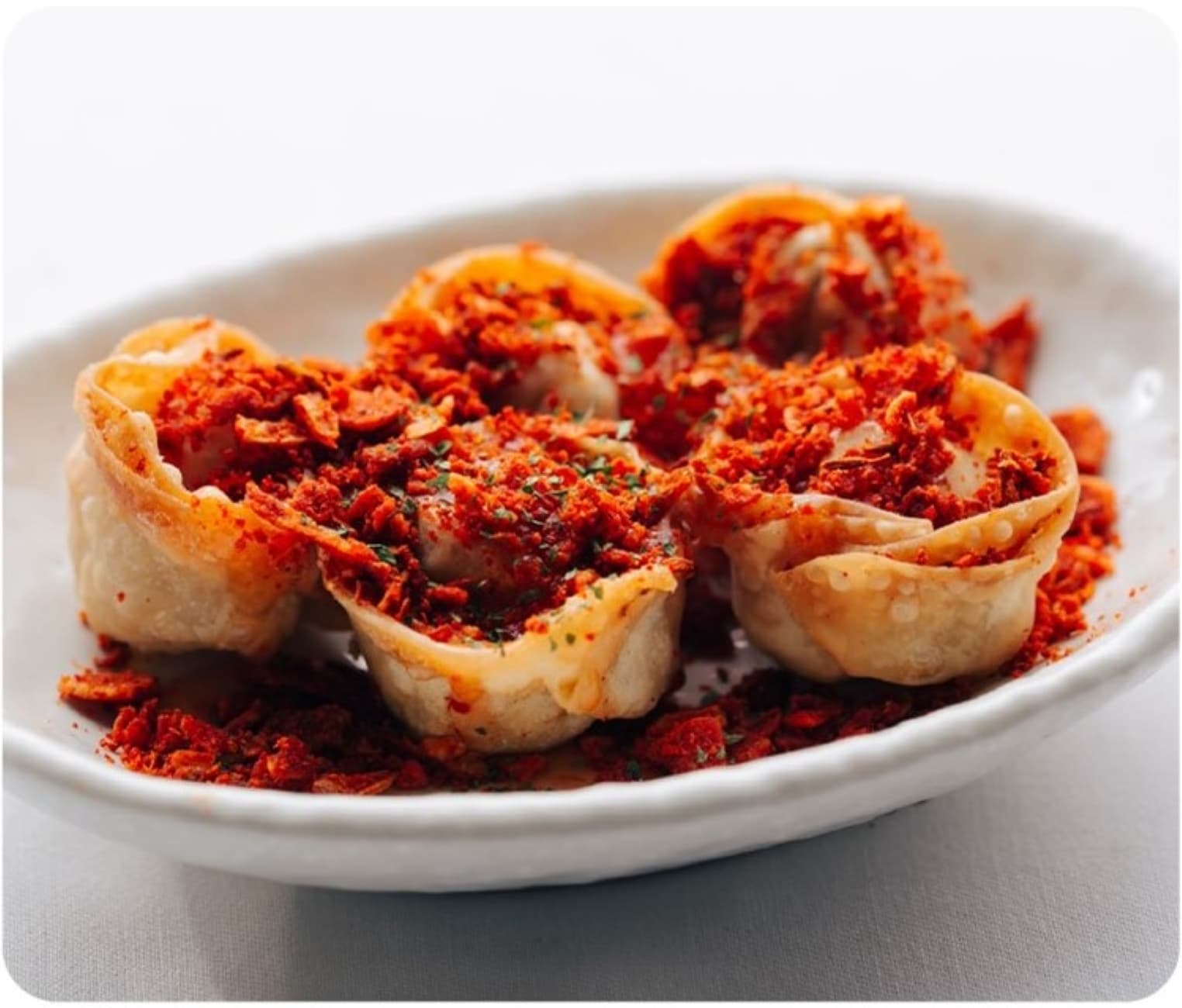 「なかよし餃子 エリザベス」の「手包み豚と生姜の焼き餃子~北海道産自家製海老ラー油~」(5個/801円) -