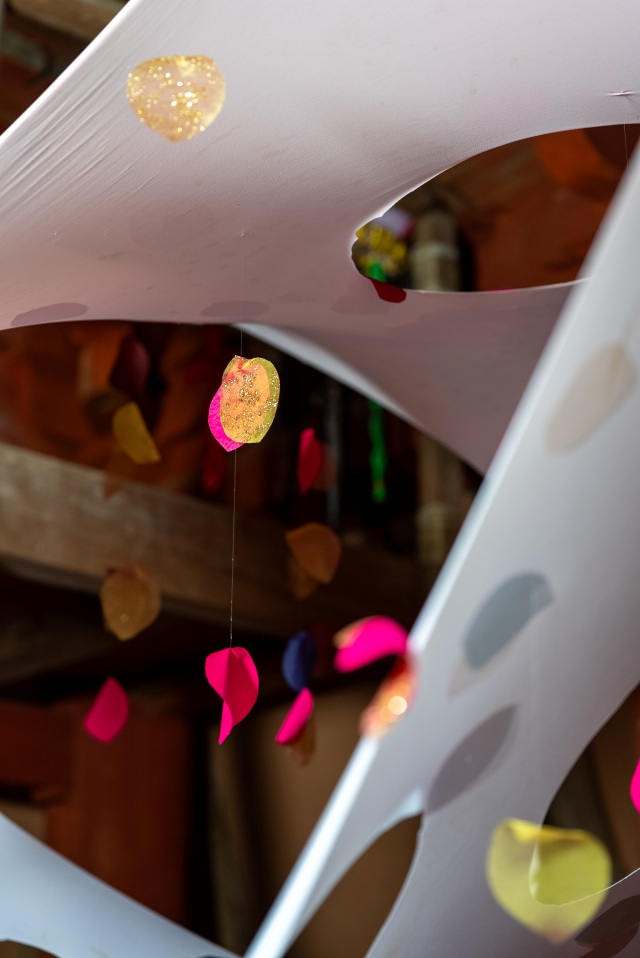 中国の祝祭的な絵柄・⾊調をモチーフに、バルーン作品を展開する周逸喬や、”⽣命⼒”をテーマに⽬に⾒えない事象を造形化する「⽥中太賀志」などが、島ならではの⾵景に作品を刻みます。