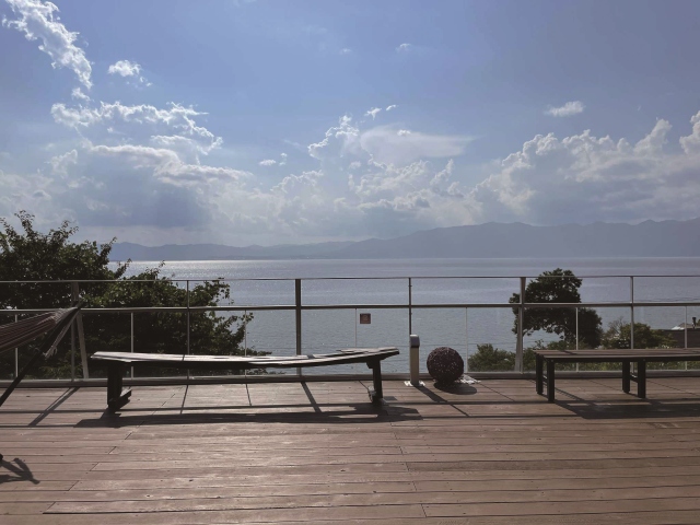 琵琶湖を⼀望する「369Terrace Cafe」の店内展示は、鑑賞パスポートなしでの⼊場が可能。アートとともにお茶を楽しむ、特別な時間が過ごせます。