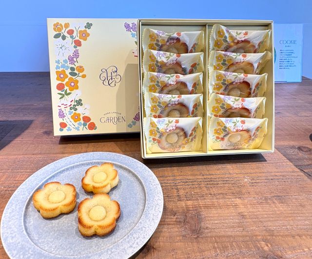 「花ラング」は、かわいいルックスと素材の個性を生かした味わいが魅力。ひとくち目のサクッと食感に続き、やわらかなクリームのハーモニーを楽しんで。ティータイムにはお気に入りの紅茶とペアリングして、いただくももよさそうです。店舗限定のおしゃれなパッケージに入っているので、ギフトにおすすめですよ!