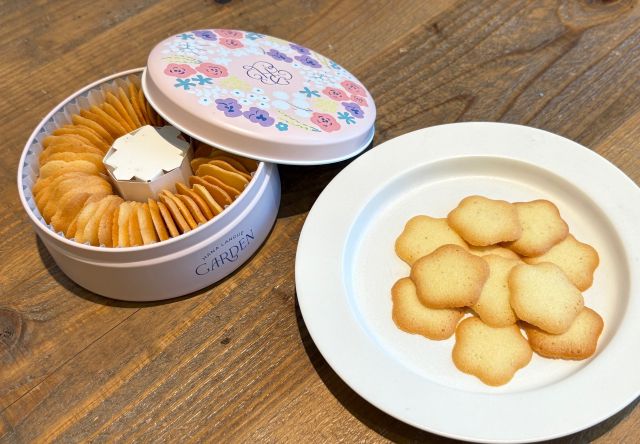 「花クッキー缶」は、フランスの伝統菓子・ラングドシャのサクサクとした食感を追求。風味豊かな発酵バターと卵白をメレンゲに仕立て、繊細な火加減で焼き上げた絶妙な軽やかさが魅力です。丸型のデザイン缶も、コレクションにしたいかわいさ!