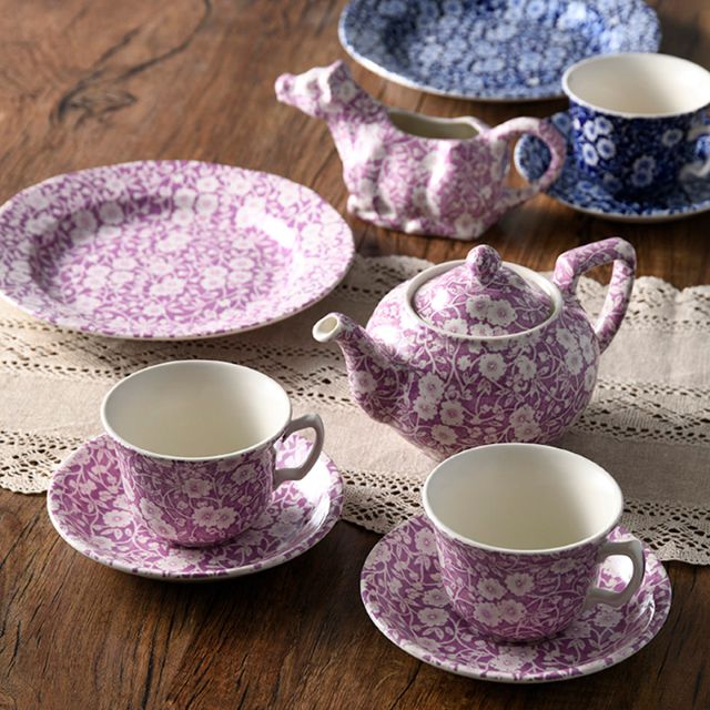 バーレイ「ブロッサムキャリコ ティーポットS」(19,800円)、「カップ&ソーサー」(各9,350円)、「プレートM」(5,280円)、「カウクリーマー」(11,000円) -