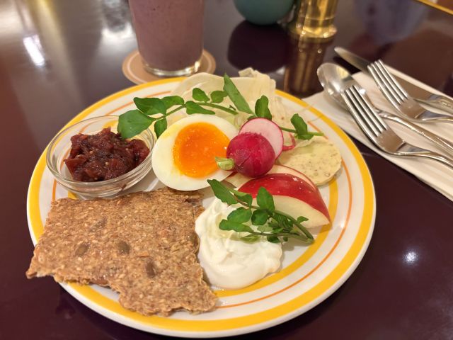 まず注目したいのが「billsプレート - 蒜山ジャージーゴーダ、ジャミーエッグ、自家製プラムアップルレリッシュ、ラブナ、そばの実バター、自家製クリスプブレッド」。